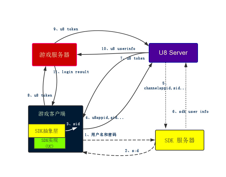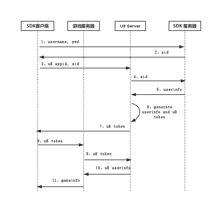客户端去U8Server二次登录认证成功之后,U8Server返回客户端U8Server生成的token,客户端紧接着开始登录游戏,同时携带这个token,游戏服务器拿着这个token,可以来U8Server进行一次登录认证。